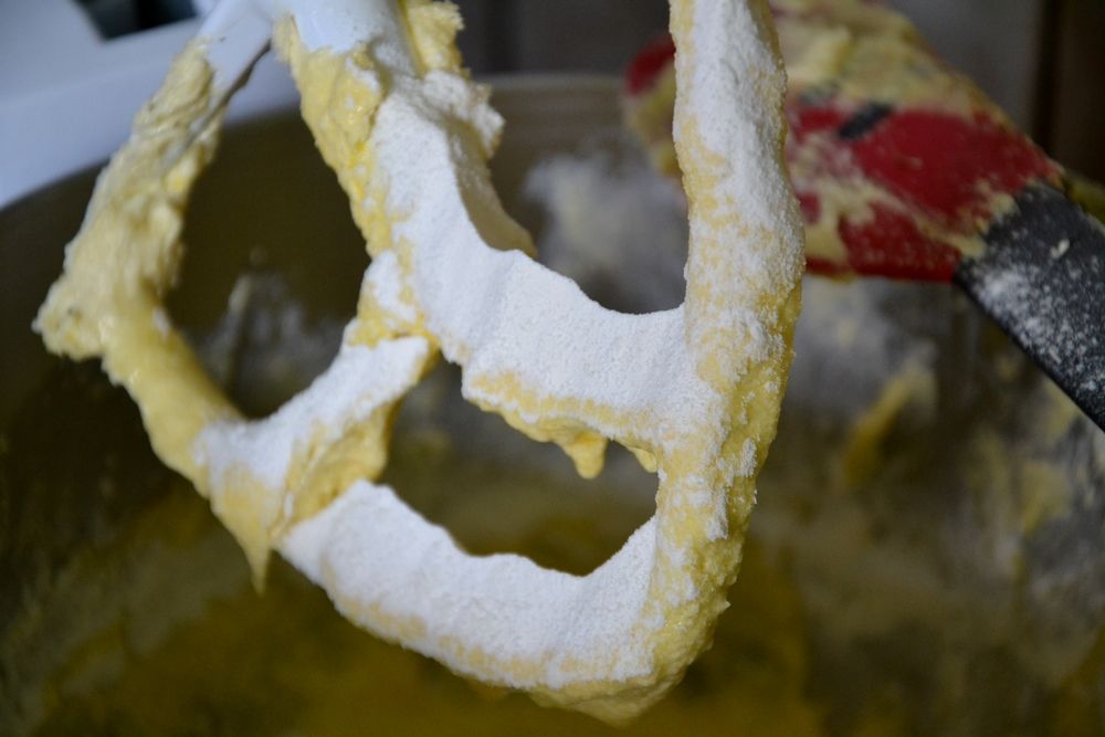 | Butter & Zucker schaumig schlagen, Eier etc. hinzu und Mehl hineinsieben. Nur noch wenig rühren mit dem Mehl. |