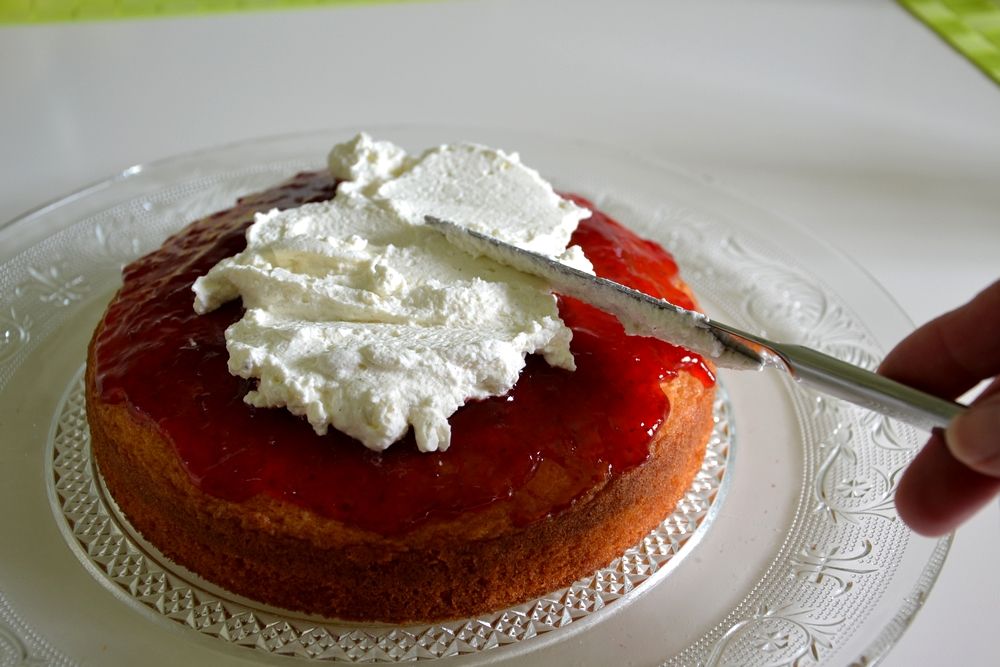 | Verteilt nun noch etwas geschlagene Sahne auf der Konfitüre... |